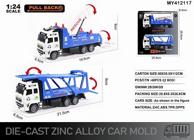 英文1:24压铸锌合金救援平板吊车+双层运输车双层套装