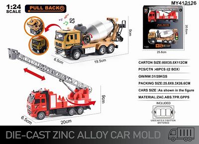 英文1:24压铸锌合金灯光音效工程搅拌车+消防云梯车双层套装