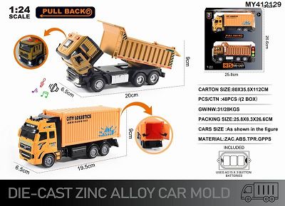 英文1:24压铸锌合金灯光音效工程自卸车+城市货柜车双层套装