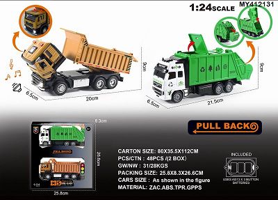 英文1:24压铸锌合金灯光音效工程自卸车+城市环保车双层套装