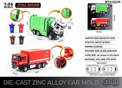 产品名称: 英文1:24压铸锌合金灯光音效城市运输货柜车+城市环卫车双层套装