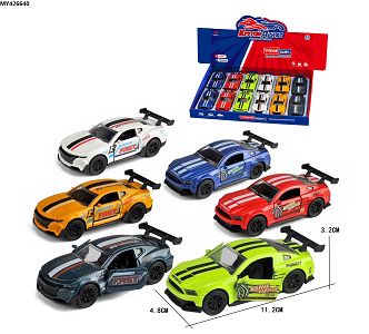 1:40福特野马,雪佛兰大黄蜂回力合金赛车,门可开,2款6色混装一展示盒