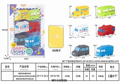 搪胶新款搪胶仿真 救护车 消防车 校车 警车 戏水 摆件 捏捏乐 BB哨 发声 软胶玩具 「1盒6只」